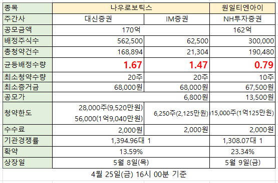나우로보틱스와 원일티엔아이의 공모주 청약이 시작되었다. 간단한 기업 소개는 지난 포스팅에서 확인 가능...