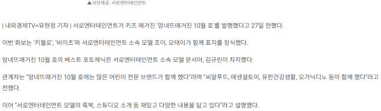 서로엔터테인먼트 키즈잡지 '앙네뜨매거진' 10월호 발행