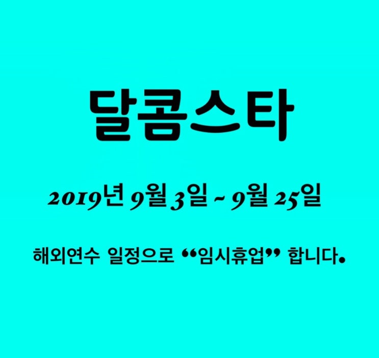 안녕하세요! 달콤스타 입니다. 9월 임시 휴업 안내 예전에 신청한 “해외연수” 신청이 갑작스럽게 진행 되...