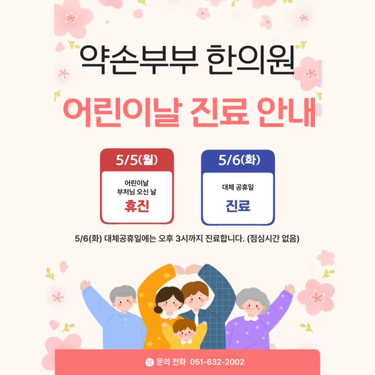 5/5(월) 어린이날은 휴진 5/6(화) 대체휴일은 점심시간 없이 3시까지 진료합니다.