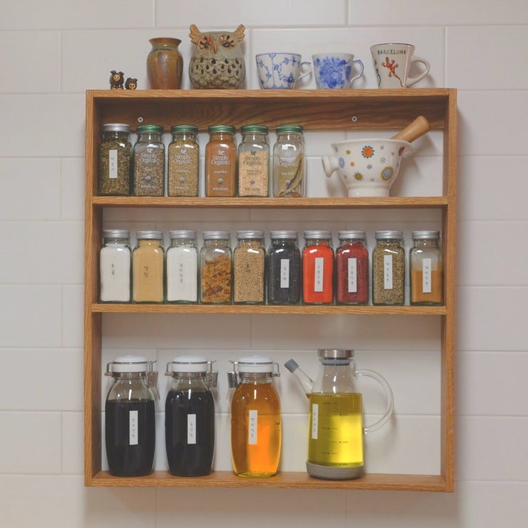 요리하기 편한 주방 / 오픈 벽선반 양념수납장 만들기 / 오크 벽선반 DIY / 양념통 정리 / 주방인테리어