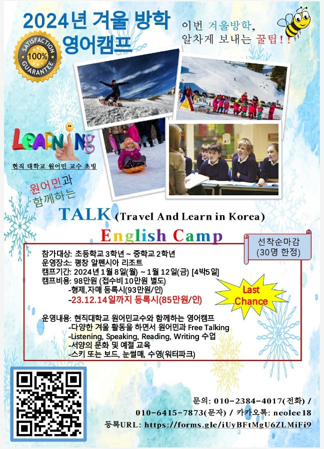 안녕하세요? 이웃님들~ 원어민이 진행하는 2024 겨울 방학 영어 캠프가 있어 소개해 드립니다. 2024 겨울 ...