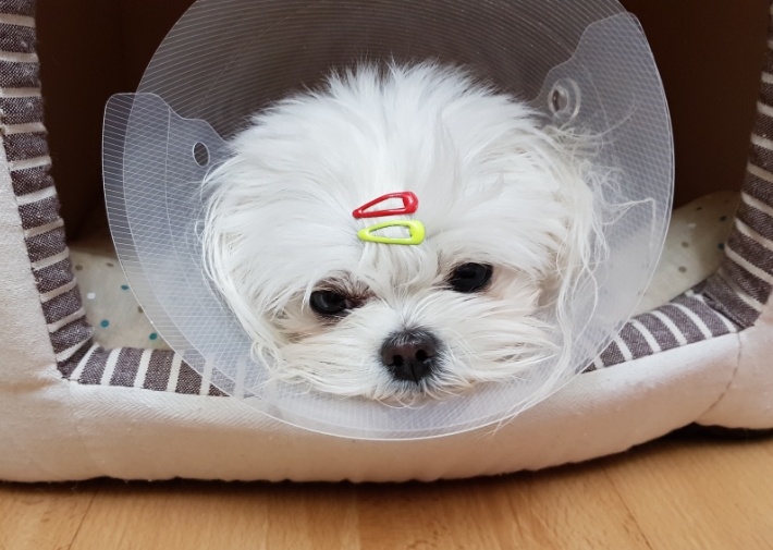 수술을 무사히 마친 쁘띠, 병원에 입원해 있다가 지난주에 퇴원했어요. 아래 사진은 막 퇴원한 후 초췌해진...