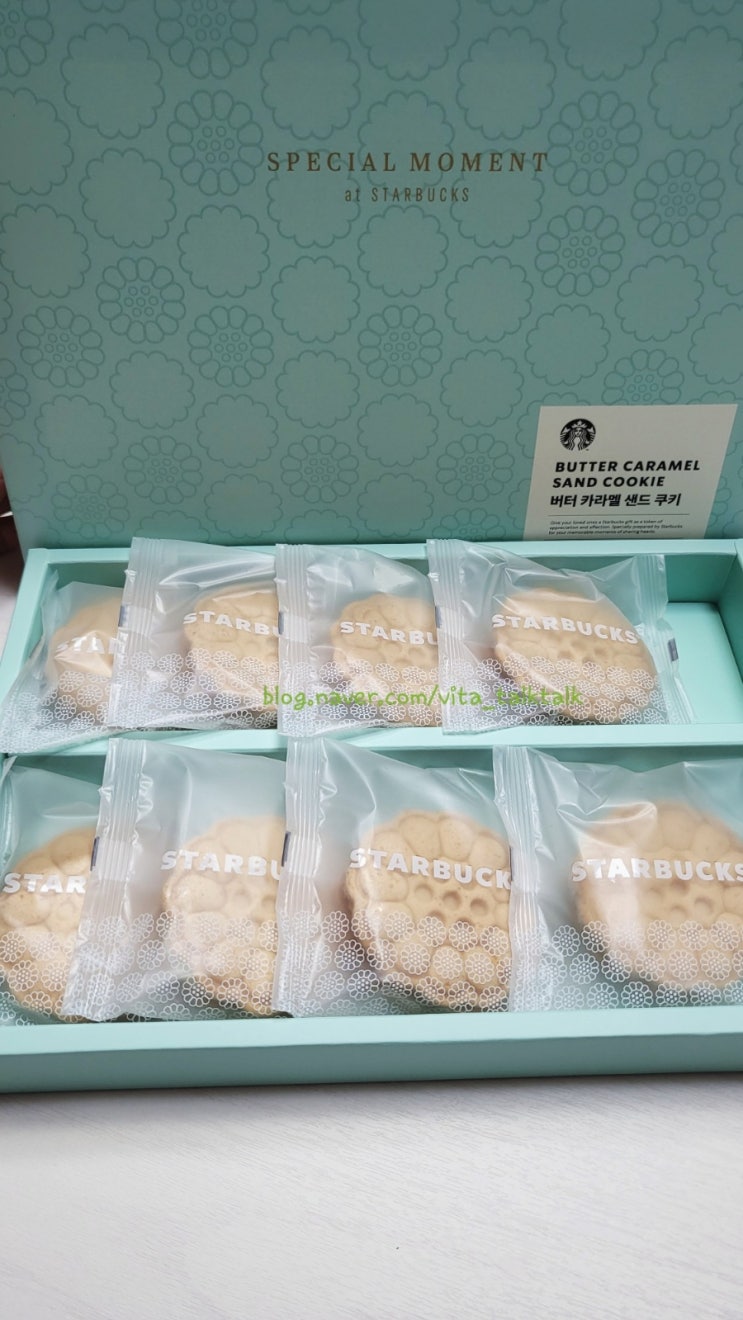 민트색 상자부터 너무 예뻤던 스타벅스 버터 카라멜 샌드 쿠키~! 이런 기프트 쿠키는 절 기분좋게 하죵ㅋㅋ...
