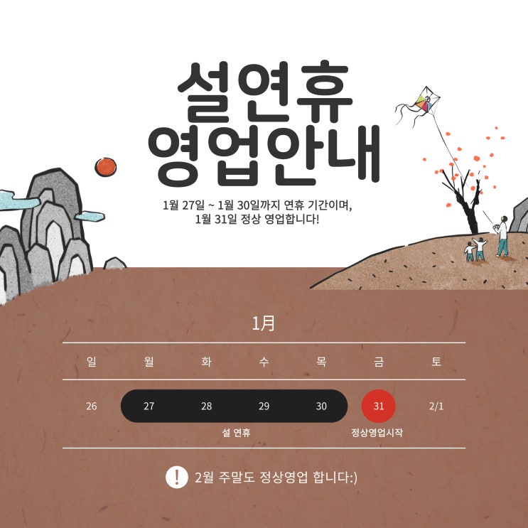 1월 27일 ~ 30일 설 연휴 31일부터 정상 영업합니다 다들 행복한 설 보내세요!