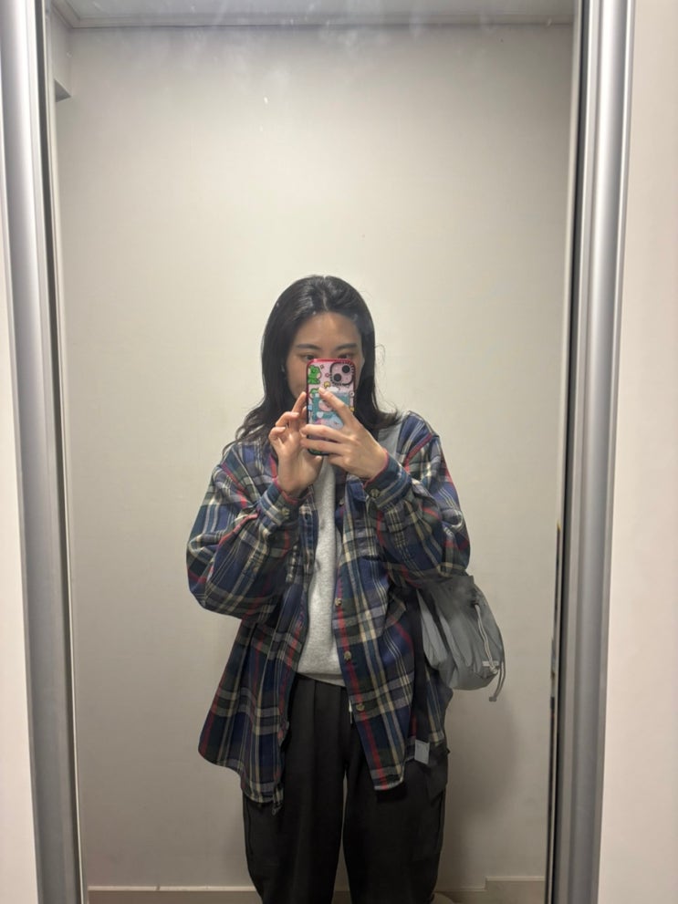 게스 체크 셔츠랑 그레이 맨투맨이랑 카고팬츠랑 로우로우 크로스백 데일리룩 코디