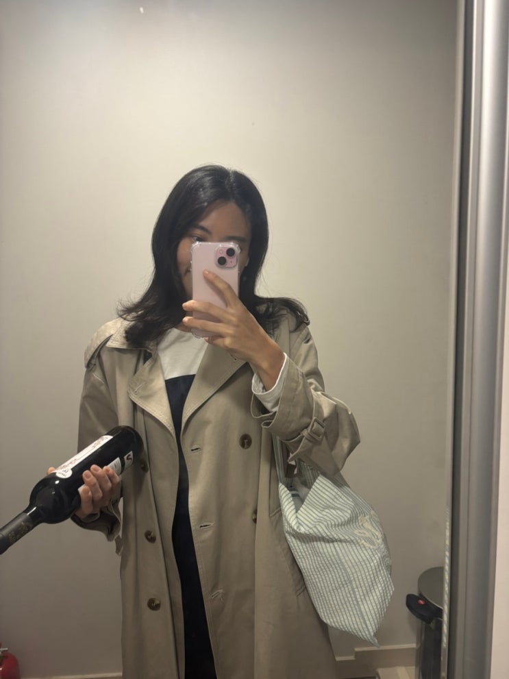트렌치코트 코디 with 타미 브이넥 니트랑 슬랙스랑 쿠에른 플렛데일리룩 코디