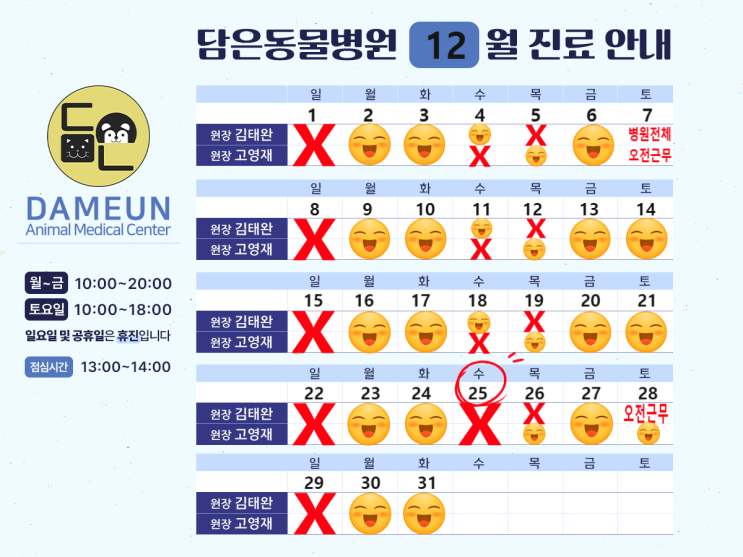 2024년 12월 담은동물병원 진료시간 안내입니다.