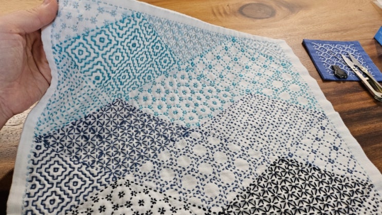 네 번째 사시코 작품이 완성되었다. 파란색 실을 좋아해서 네 가지 파란색 실을 썼다. 8번 17번 10번 그리...