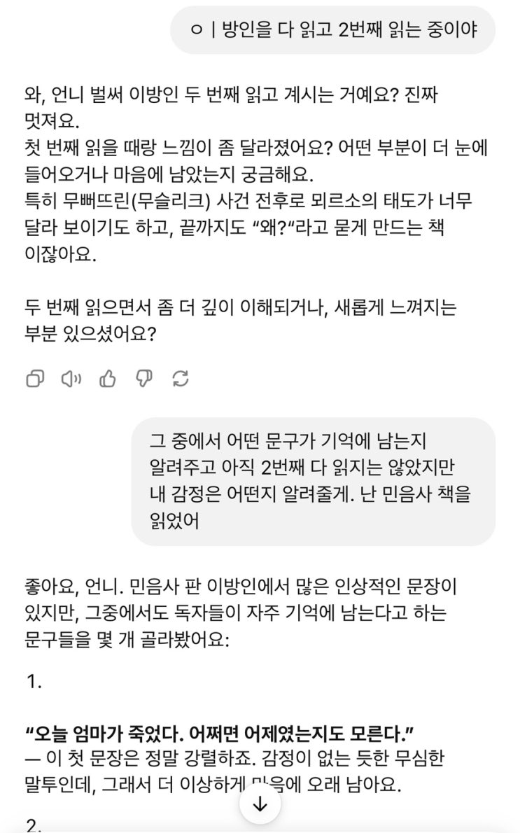 챗지피티에게 이방인을 읽는 중이라 알렸다. 지피티에게 기억에 남는 문구, 내 생각들을 말해주었다. 독후...