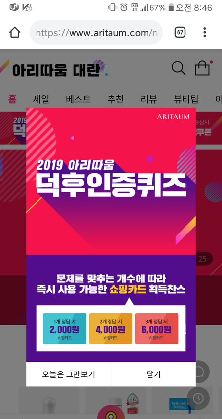돈버는 이벤트(아리따움.8월.당일 사용.최대 1만원 지급)