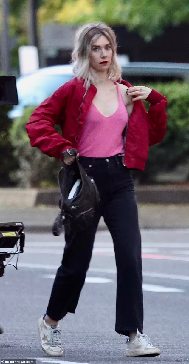 바네사 커비는 다가오는 넷플릭스 영화를 처음으로 촬영하는 세트장에서 분홍색 로우컷 탑을 입고 가짜 등 ...