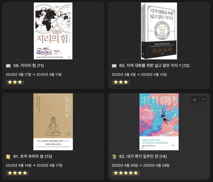 4월 독서 피드백 (feaf 지리의 힘, 지적 대화를 위한 넓고 얕은 지식 1, 초역 부처의 말, 내가 죽기 일주일 전)