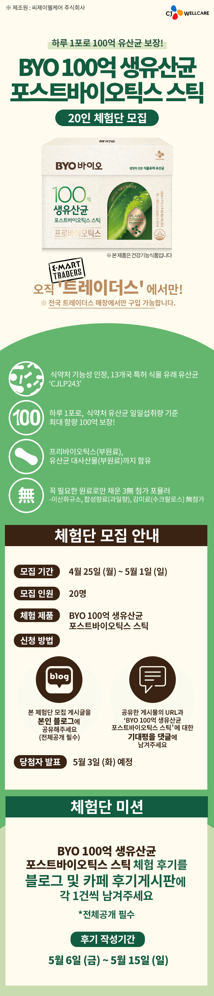 BYO 100억 생유산균 포스트바이틱스 스틱 체험단 20인 모집 모집기간 : 4월 25일(월) ~ 5월 1일 (일) 당...