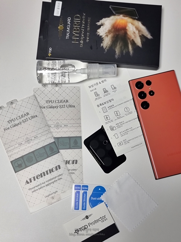 강력하게 액정을 보호하고 부착방법도 참 쉬운 TGD 트라움가드 하이브리드방탄필름으로 갤럭시 S22울트...