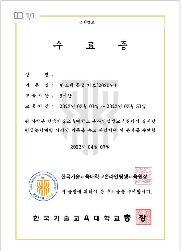 <한국기술교육대학교> 반도체공정기초 수료 후기