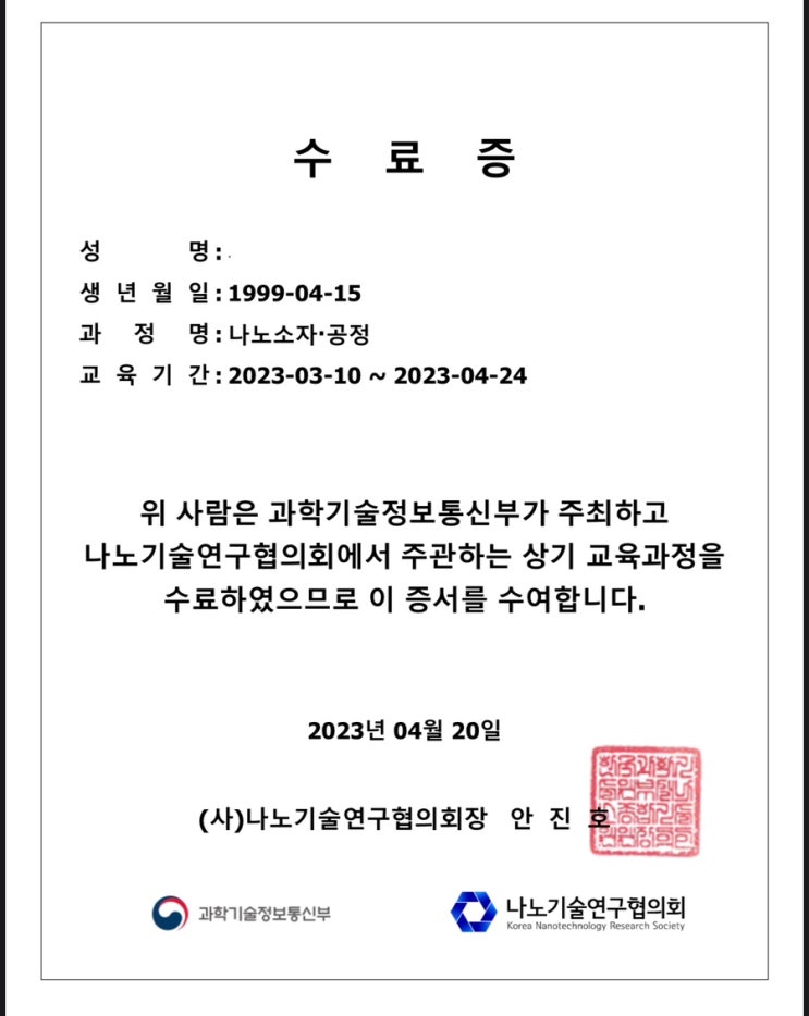 <나노기술연구협의회> 나노소자공정 이론교육 수료 후기