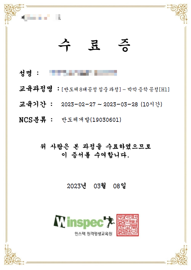 <윈스펙> 반도체 NCS 강의 후기 (반도체 소자 및 전공정 핵심과정/ 포토 공정/ 식각공정/ 박막증착공정)