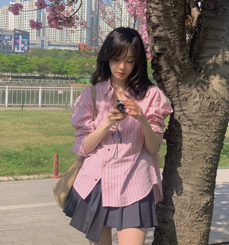 벚꽃룩 최강자 등장? 강민경의 핑크 스트라이프 셔츠 코디 정보
