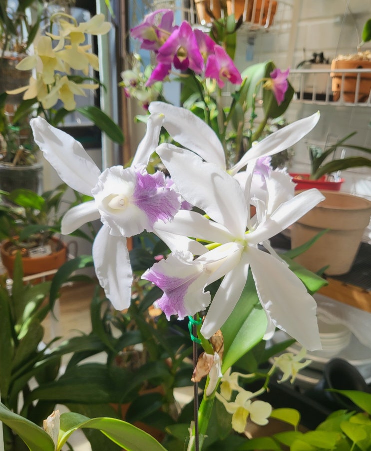 카틀레야와 환타지아 개화 중인 애들 한 판에 모았습니다. 온시디움 댄싱 걸이랑 덴파레는 자잘해서 ...