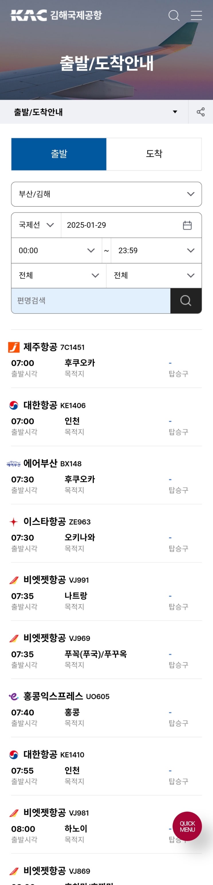 2025년 1월 29일 김해국제공항 대구국제공항 국제선 출발편 자료 아카이브