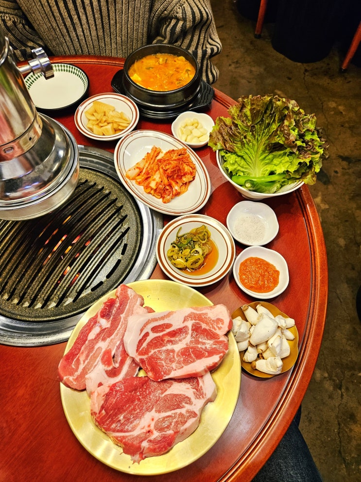 상수고기집 상수동 교자상 두툼한 생삼겹설과 생목살