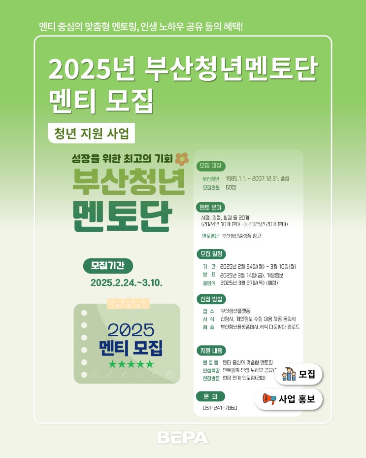 안녕하세요, 부산경제진흥원입니다. 오늘은 2025년 부산청년 멘토단 멘티 모집 소식을 안내드리려고 합니다...