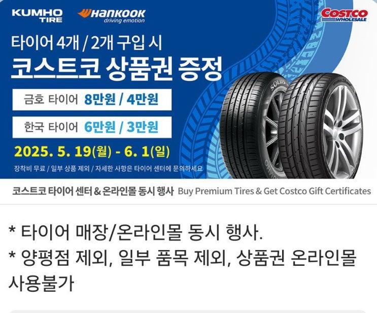 2025년 5월 코스트코 타이어 행사! 금호·한국타이어 사면 상품권 준다? 코스트코 타이어센터 할인 혜택 체크
