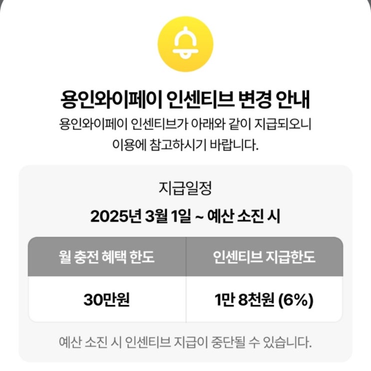 3월 용인 와이페이 인센티브 6% 3월 와이페이 충전 혜택한도 30만원 *와이페이 충전혜택이 6% 라 아쉽지만 ...