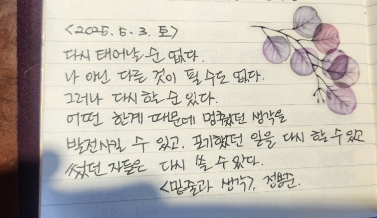 다시 태어날 순 없다. 나 아닌 다른 것이 될 수도 없다. 그러나 다시 할 순 있다. 어떤 한계 때문에 멈췄던...