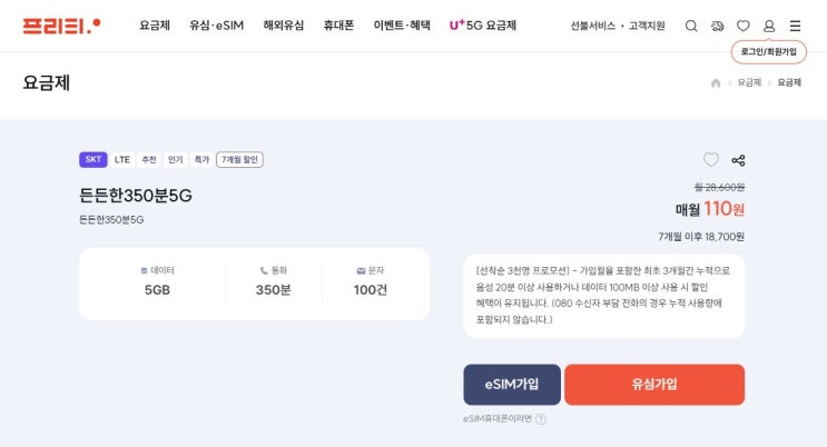 프리티(5GB+350분+문자100건) 7개월 110원