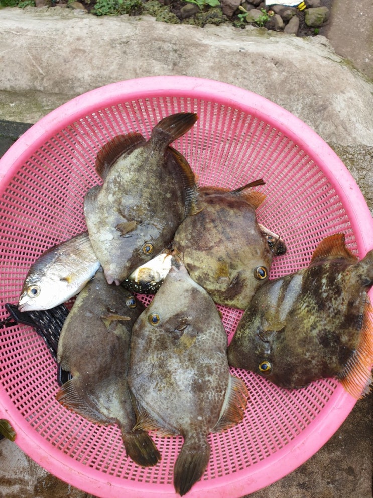 화순항 위 소금막 갯바위에 모살치(보리멸) 낚으러 갔더니 대상 어종은 없고 쥐치(객주리)로 손맛보고 회떠...