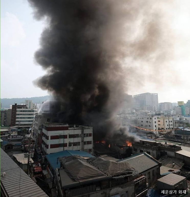 세운상가 인근 화재 5시간 만에 초진…48개 점포 소실. 28일 오후 서울 중구 을지로 세운상가 인근 재개발 ...