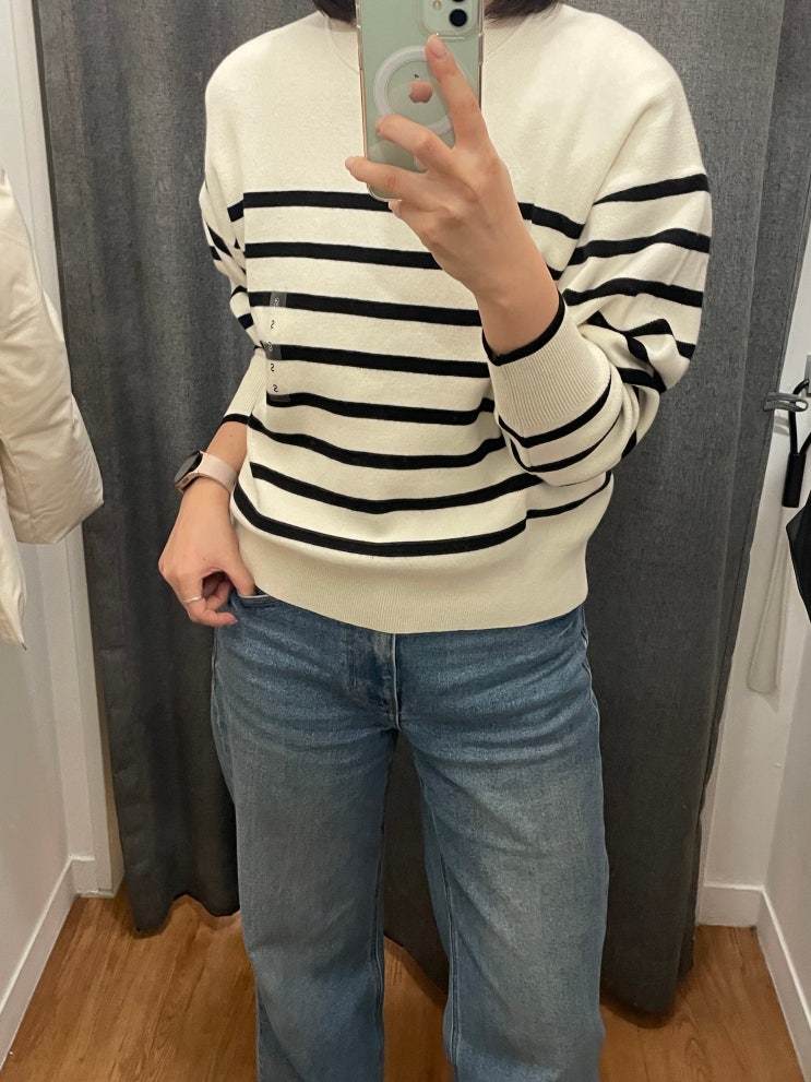 유니클로 출근룩 니트추천 스무드 코튼 릴랙스 스트라이프 크루넥 니트 사이즈 추천 S착용샷