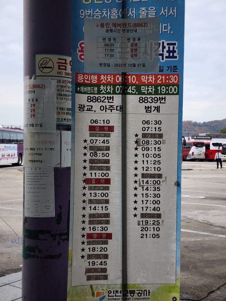 인천터미널에서 출발하는 8862 시간표. 기존에 운행하던, 06:55 11:50 17:20 운행안함. (작성일: 2022. 11....