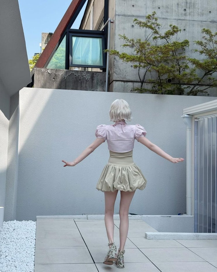 우기, 하이틴 무드 터지는 벌룬 스커트와 크롭 셔츠 스타일링