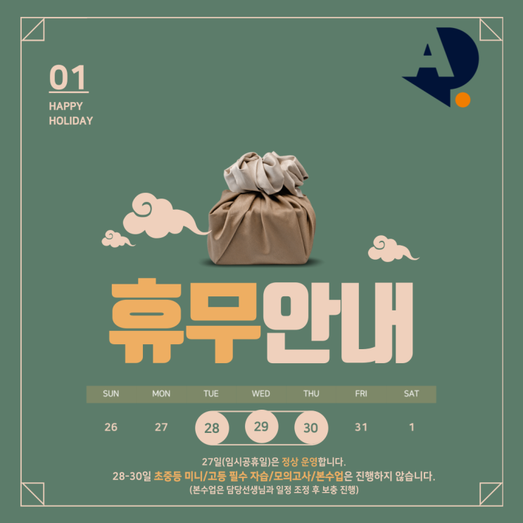 안녕하세요. 에이닷 영어학원 대구수성점입니다. 설 연휴 (28-30일) 휴무입니다. 27일(임시공휴일)은 정상 ...