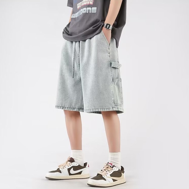 데님 카고 5부 반바지 남성 주니어 학생 청반바지 밴딩 힙한스타일 여름 와이드 포켓 팬츠