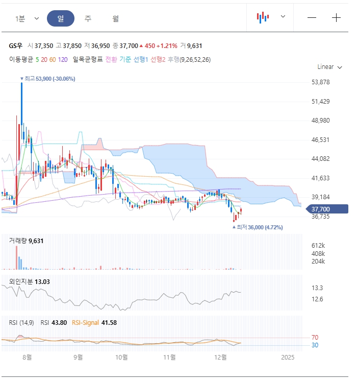 클로드 AI 답변 - 주식 차트를 분석해 보겠습니다. 현재 GS우 주가는 37,700원이며, 일목균형표 기술적...
