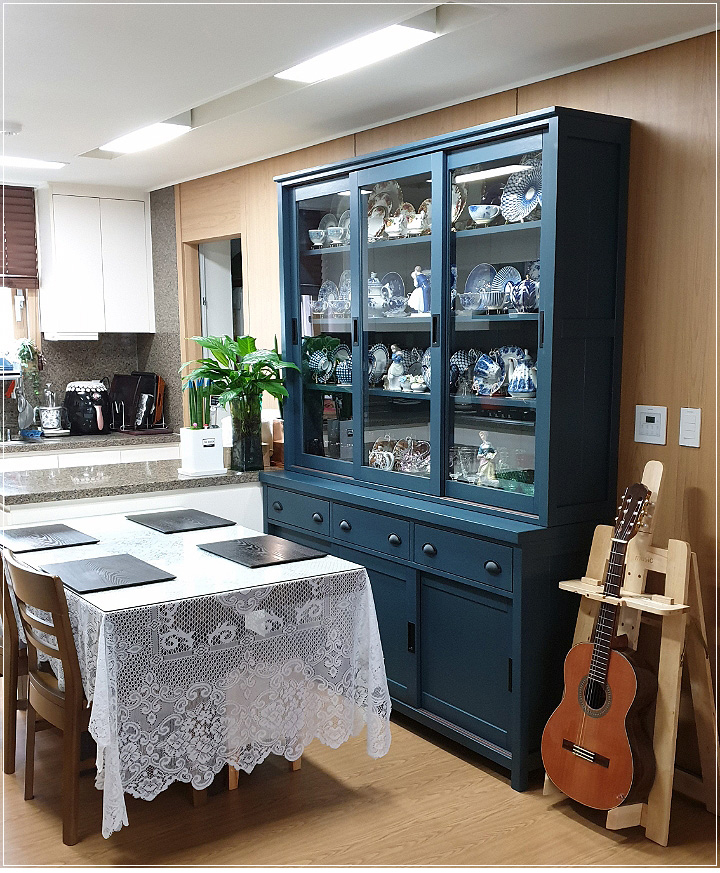 다크네이비 컬러로 제작된 원목그릇장으로 포인트가구로 좋으며 미닫이문으로 공간활용에도 도움을 줍니다....