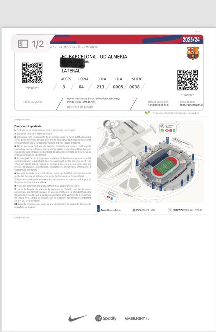 오후 일정은 바르셀로나 경기 관람. 티켓은 미리 예매. 어디서 했더라,,,, 구글에서 검색해서 들어간거 같...