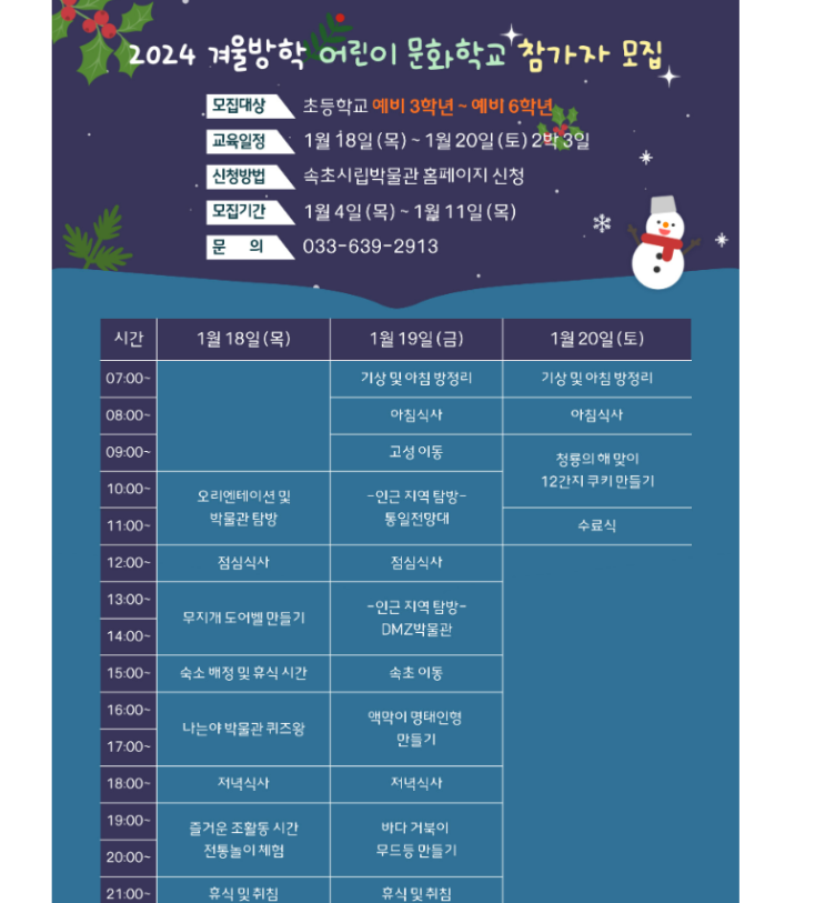 [시골 재학생] 신청마감: 2024 겨울방학 어린이 문화학교 (1. 18.~1. 20.) 속초시립박물관
