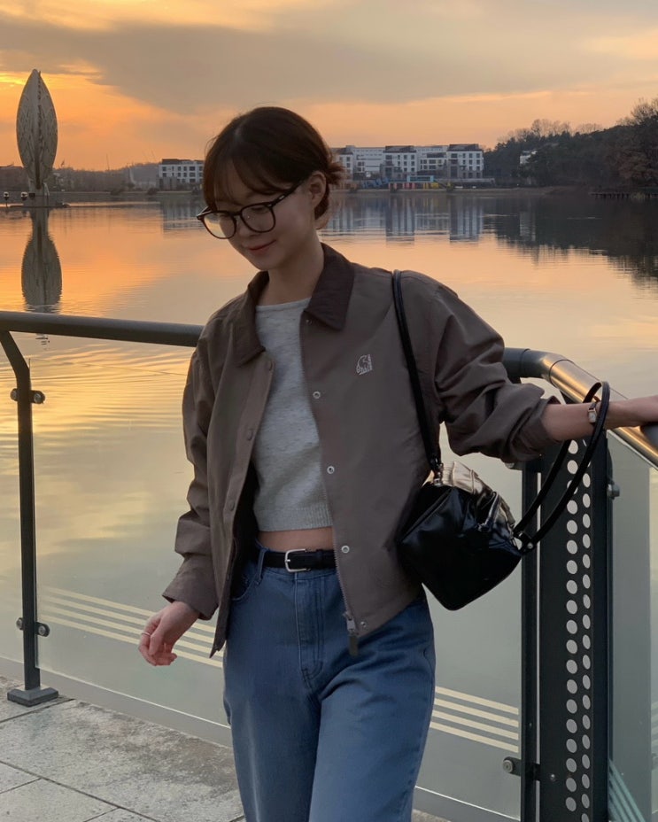 노르디스크 봄 헌팅자켓 세미크롭 카라배색 카라자켓 데님 아우터 코디룩