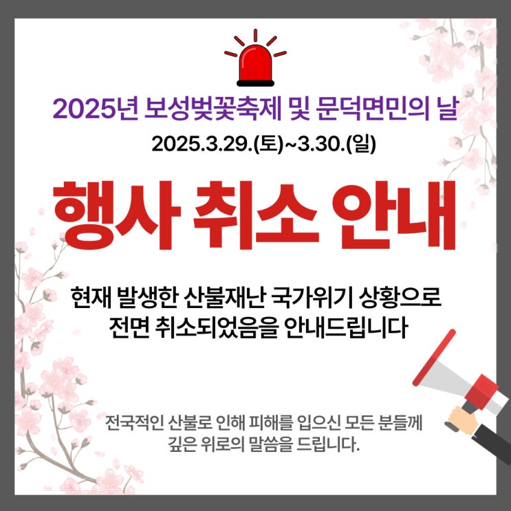 2025년 보성벚꽃축제 및 문덕면민의 날 2025.03.29.(토) - 03.30.(일) 행사 취소 안내 현재 발생한 산불재...