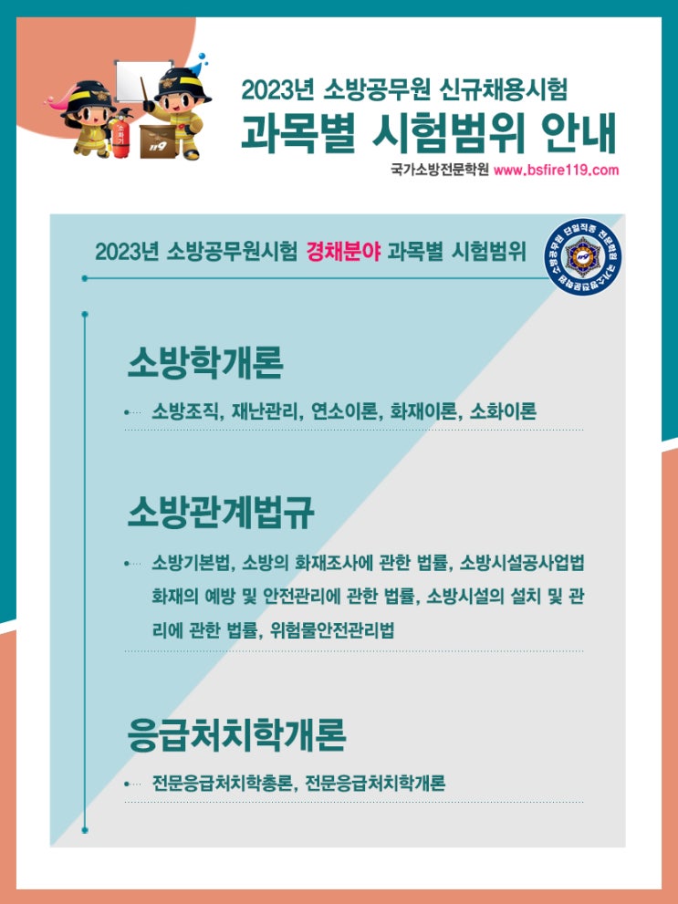 2023년 소방공무원 경채분야 소방학개론, 소방관계법규, 응급처치학개론 시험범위