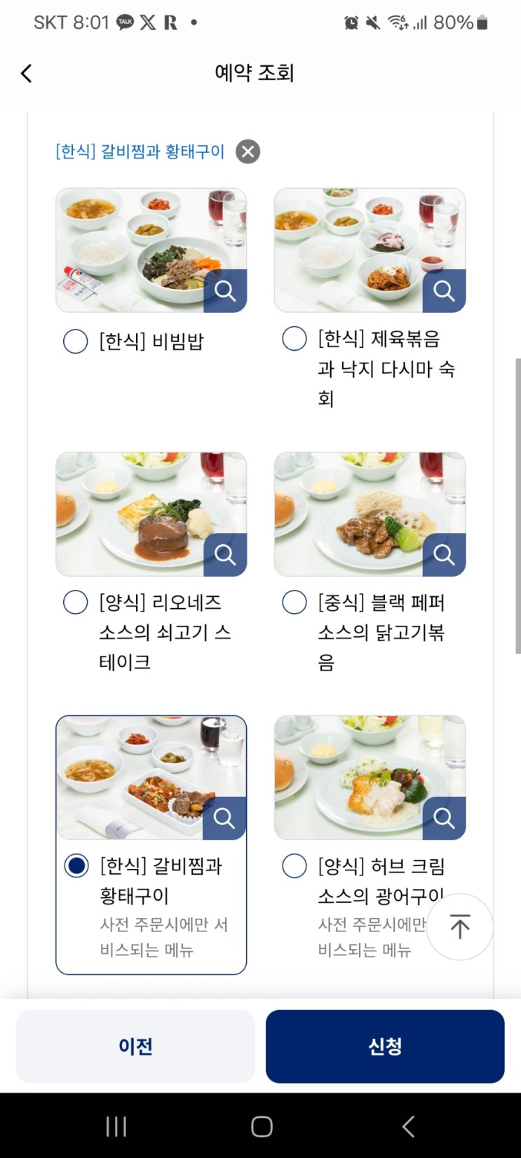 대한항공 프레스티지클래스 B747 기내식 사전 주문 - 갈비찜, 광어구이, 닭고기, 크림파스타 - ICN발에 한함