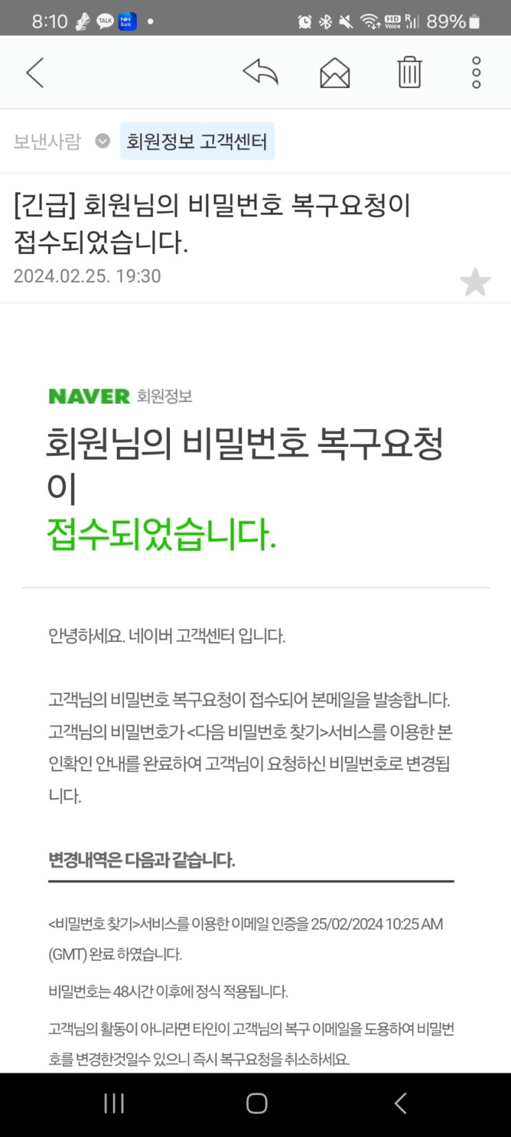 네이버 스팸 사기! [긴급] 회원님의 비밀번호 복구요청이 접수되었습니다