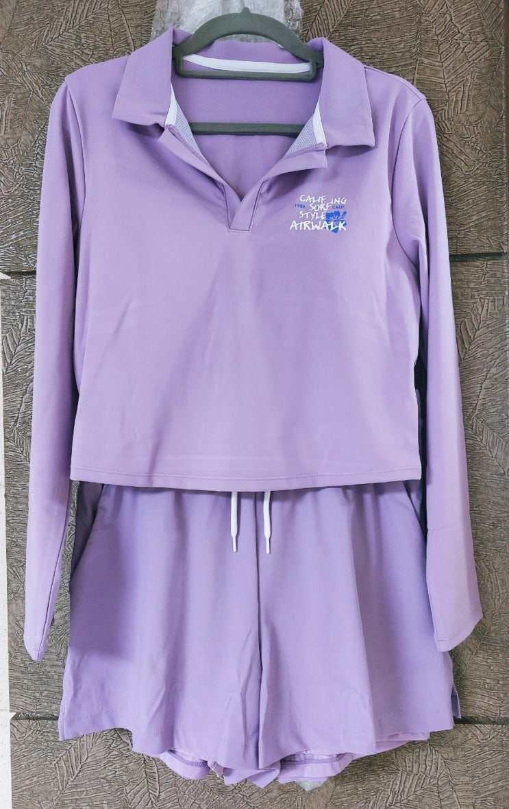 여성래쉬가드,래쉬가드세트,카라래쉬가드,캡내장래쉬가드,세미크롭래쉬가드 - 에어워크서프 크롭 카라 티셔츠 라일락 + 3부 끈반바지레깅스 라일락 세트