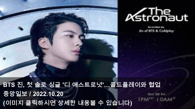 [오늘의 KPOP 소식] 22.10.20 BTS 진, 첫 솔로 싱글 '디 애스트로넛'…콜드플레이와 협업 & BTS 슈가·지민, 한국관광 홍보영상에…부산블루스·대전로큰롤 & "하이