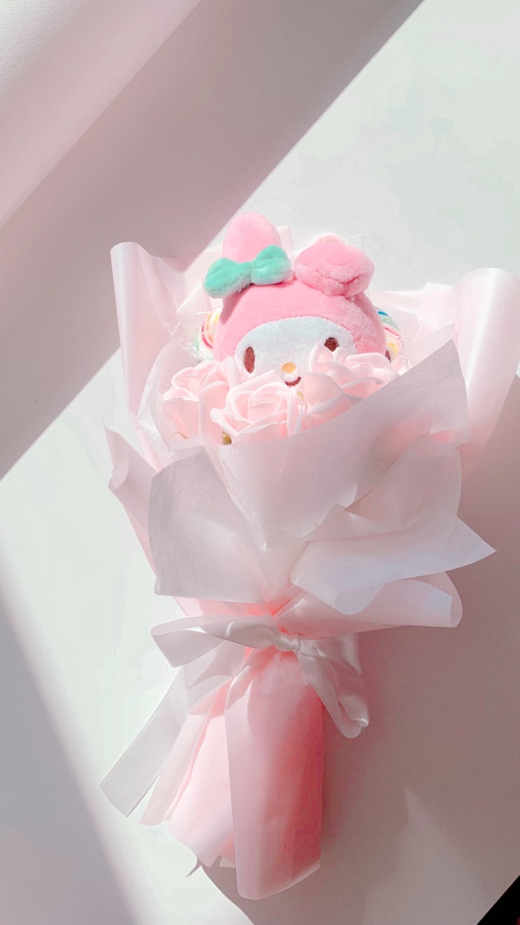 이번에 만들어 본 산리오 마이멜로디 인형꽃다발입니다 산리오 중에 가장 좋아하는 인형이 뭐냐고 물으신다...